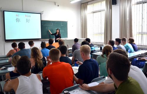 5月27日,国外大学生日常汉语会话学习的第一课开讲,2013年首批来自美国日常汉语会话学习的30名高校大学生将在我校国际学院进行为期5周的汉语培训。这也标志着我校2013年暑期国外大学生汉语短期培训项目正式开始。