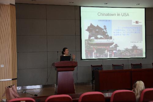 期间,美国学生参观了汉语教室、中国文化体验室和公寓楼,并观看了我校的英文宣传片。人文社会发展学院周仕慧副教授为同学们做了题为“大唐盛世,梦回长安”的报告。报告以名胜古迹、诗词歌赋为切入点,从历史发展、国际交流、文化传承等方面向同学们展示了古长安的繁华盛世,重现了穿越千年的长安美景,获得美国学生的一致好评。